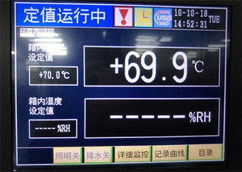 高温储存:70℃,持续时间23小时,在试验箱温度恢复到室温后,拿出观察,表面与放入之前对比,无裂痕,破损现象;